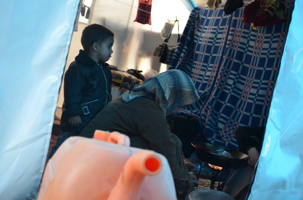 كانت محطتنا الأولى مخيم تل الكرامة، وقابلت فيه أماً قائمةً بجوار خيمتها على تحضير الغداء لأطفالها. حييتها وسرعان ما كانت تقص علي حكايتها فيما ابنتها ذات السنوات الست تلتقط الصور بعد شرح سريع مني. كان عمر المخيم أيام قليلة، وأتى الناس إليه من قرىً عدة في ريف حماة بعد بدء المعارك هناك وبعد أن أصبحت بيوتهم أهدافاً لصواريخ النظام  وطيرانه الحربي. تحدثت مع الأم لنصف ساعة حكت فيها كيف كانوا جسديًا أكثر راحةً في بيتهم، ولكنها لم تكن لتحتمل المزيد من ليالي الترقب ساهرةً وأطفالها تحت ناظريها وهي تسمع أصوات القذائف تقترب منها وتدك البيوت من حولها.