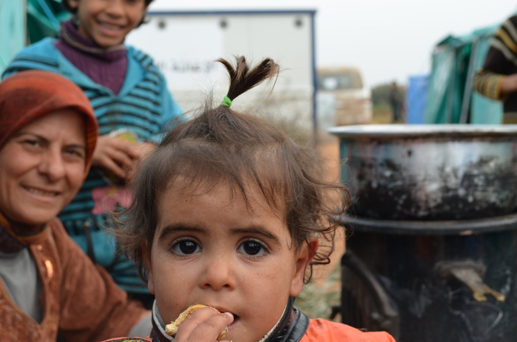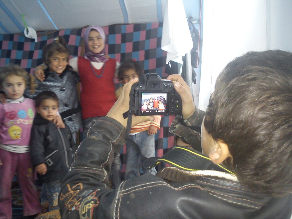 رافقت في يومي الثالث مجموعة من الناشطين الأمريكيين من أصول سورية في رحلة إلى مخيمين صغيرين نسبيًا داخل الأراضي السورية على مقربة من الحدود. كان في كل منهما عدة آلاف من النازحين يعيشون في الخيام. فيما كان الإخوة الذين رافقتهم يوزعون المعونات ويوثقون حال المخيم، كنت أبدأ محادثات مع الناس لأعرف المزيد عن الظروف التي مروا بها وأطفالهم. كنت أحيي من ألقاه من الوالدين برفقة أولاده فيما يقومون ببعض شأنهم بجوار خيمتهم، ثم أسألهم عن أحوالهم. كان الناس بطبيعتهم كرماء وطيبين وراغبين بالحديث، وسرعان ما كانوا يدعونني لتناول شيء من الشاي أو القهوة من القليل مما استطاعوا جلبه معهم، ومن ثم يبدؤون رواية حكاياتهم. كنت خلال ذلك أعطي الأطفال آلة التصوير خاصتي وأشرح لهم بسرعة كيفية التقاط الصور وأطلب منهم التقاط ما يحبون من الصور فيما أتكلم مع والديهم. فعلت ذلك لسببين: الأول إيماني بأن الأطفال (والمتعلمين عمومًا) يحصلون على قدر أكبر من التمكين عندما ينشؤون ويبنون شيئاً ما. استمتع هؤلاء الأطفال بالوقوف أمام زوار المخيم ليصوروهم، ولكنهم لم يلتقطوا صورًا قط. أما السبب الثاني فأني لم أستسغ شخصياً تصويرهم كما لو كنت سائحًا. معظم الصور التالية من تصوير الأطفال أنفسهم.
