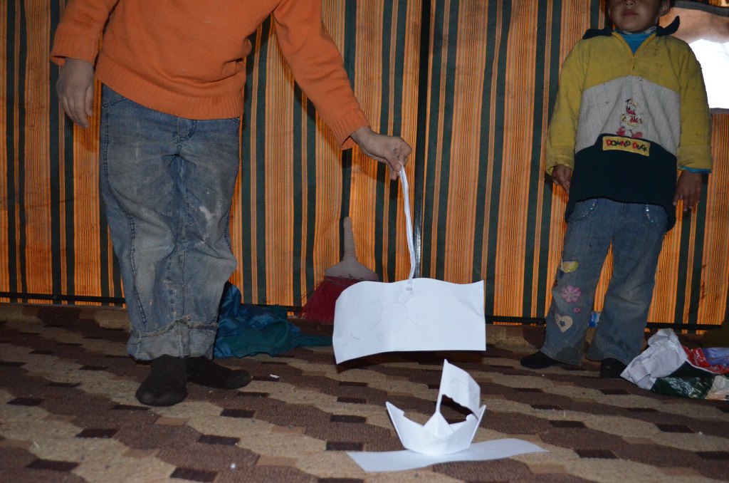 أتاني العديد من الأطفال بعد انقضاء صلاة العصر — وكنا ما نزال في المسجد — طالبين أن ألتقط صورًا لهم، ولكني لم أتشجع لذلك (وراودني شعور السائح ثانيةً)، وكان عدد الأطفال أكبر من أعطيهم آلة التصوير ليأخذوا الصور بأنفسهم. عرضت عليهم بدل ذلك أن نبدأ بصنع بعض الرسوم المتحركة وأريتهم ما فعلته مع أبناء أبي مصطفى في اليوم السابق، وجهدت نفسي لأريهم أمثلةً أخرى لم تكن بالغة النجاح، ولكن كنت أشير إلى أخطائي بأنها أمور عليهم اجتنابها عند تنفيذ مشاريعهم 😛 توزّع الأطفال في فرق لإنشاء مشاريع صغيرة واقترحت إنشاء شخصيات مختلفة من الورق وتحريكها لأقوم بتصويرها، وسرعان ما بدؤوا إنشاء أشكالهم الخاصة وابتكار طرائق للتغلب على التحديات التي واجهوها كإضافة خلفية لرسومهم. أنشأت الفرق المختلفة مشاريع بجودة متنوعة، ولكن البعض أمتعه مجرد فكرة تقطيع الأوراق لإنشاء أشكال منها.