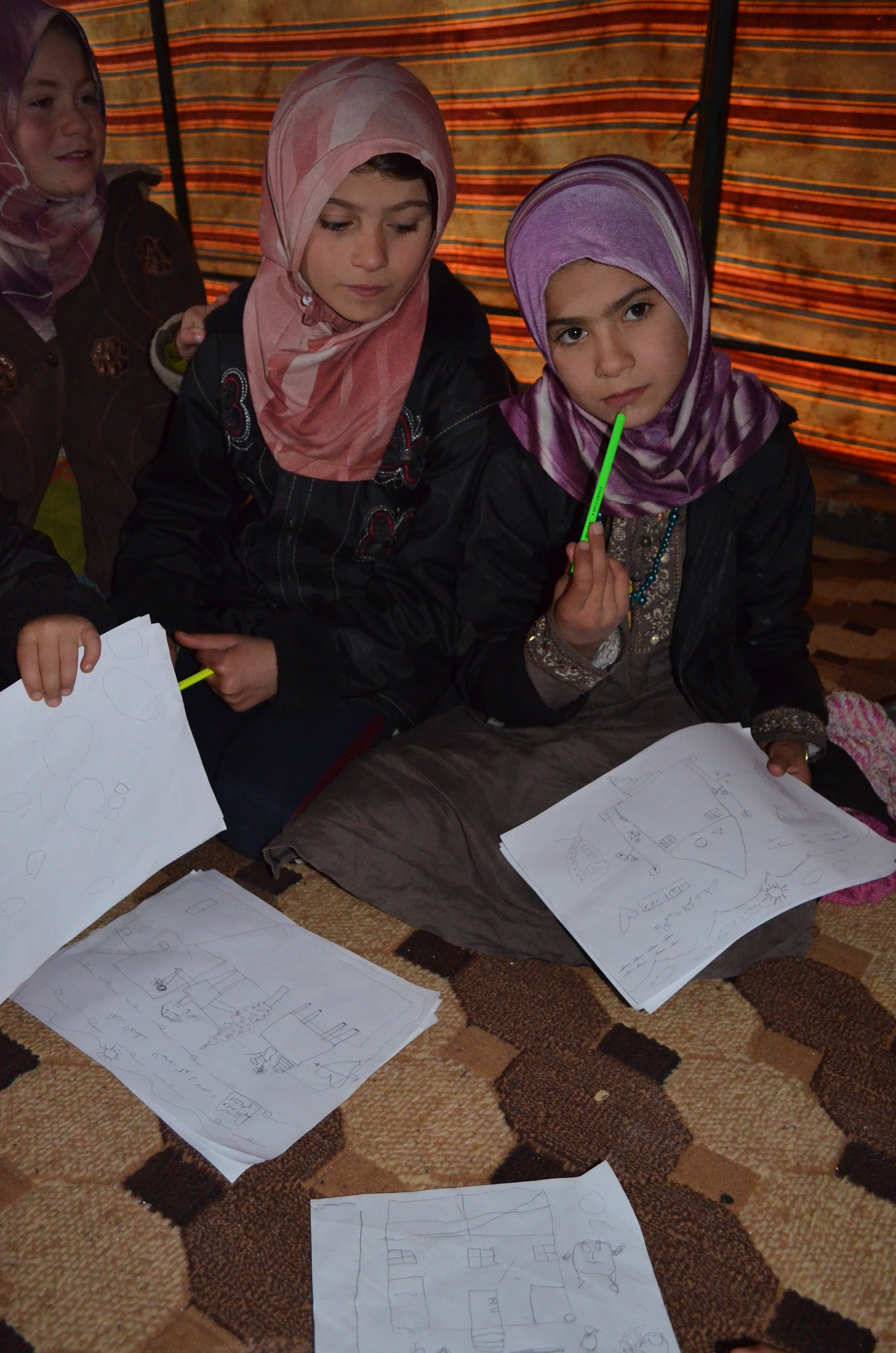 عندما دخلنا الخيمة كان هناك درس للأولاد في النصف الأمامي من الخيمة. كان معي سبع بنات وصبي ولم أكن قد قابلت المدرس وسيمًا أو أنسق معه، فطلبت من أطفالي الجلوس في مؤخرة المسجد. أردت أن أبدأ مع الأطفال بنشاط سهل يستطيعه جميعهم (أسمي هذا النوع من الأنشطة ذات أرضية منخفضة)، وأستطيع خلاله تشجيعهم على التحدث إليّ عما يعرفون لتعزيز العلاقة بيننا. أعطيت كلًا منهم ورقتين وقلم رصاص وأخبرتهم أن يرسموا ما يشاؤون دون أن يفتعلوا الكثير من الضجة. كانت معظم الرسومات منازل مع أنهار وجبال، وكلما أعلن أحد الأطفال انتهاءه وأراني ما رسم كنت أطلب منه إخباري عما رسمه والقصة منه. لم تكن لدى معظمهم أي قصة فكنت أسألهم أن يسمّوا لي ما رسموا على الأقل: بيوتًا وأشجارًا وطيورًا وهكذا، ليبدؤوا التحدث إلي.
