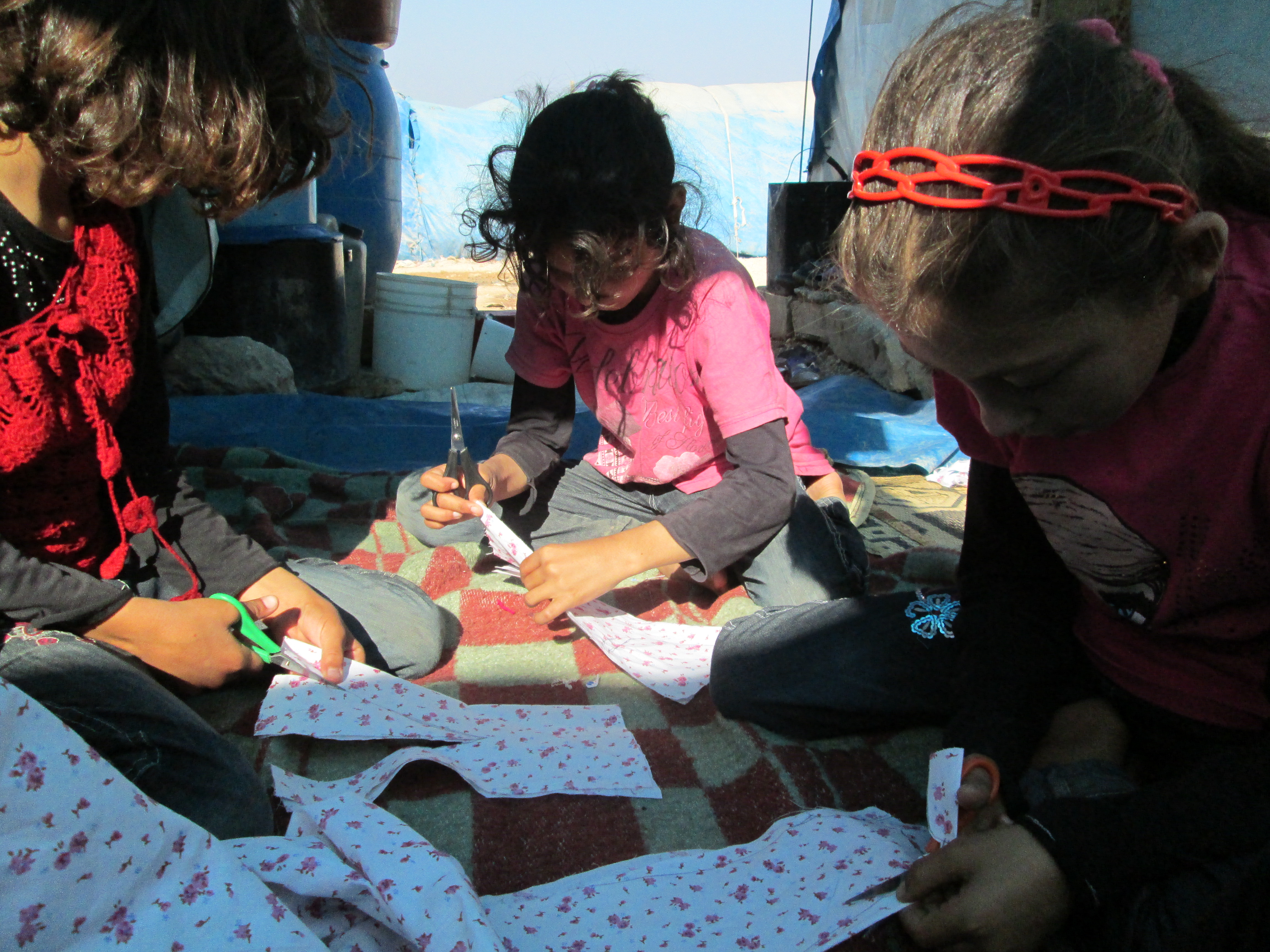 كنا تلتقي في خيمة فاطمة حيث كان أبو فاطمة (وزوج المشرفة) ينضم إلينا. كنت والبنات نتحدث لبعض الوقت عما فعلن وما الذي كان بحاجة إلى المزيد من العمل وكيف يمكنهن المتابعة؛ ثم ألتفت إلى أبي فاطمة لنتبادل القصص ونتحدث عن النشاط الذي تقوم به البنات والأفكار التي تقف خلفه (وملمحًا إلى ما يمكن للمشرفة فعله لتدعم البنات بشكل أمثل). كانت البنات يشاركن في حديث ”الكبار“ من حين لآخر أو تكون لهن أحاديثهن الخاصة ضاحكات ومتجادلات فيما يلتقطن المزيد من الصور. شعرت أني كنت أمضي في الاتجاه الصحيح، رغم إدراكي أنه طريق طويل ما زلنا نخطوا فيه خطواتنا الأولى. لكن الشمال ما عاد كما زرته في رحلتي الأولى وما عاد مرحبًا بنا كما في السابق، مما ترك مخاوف عندي بخصوص سلامتنا وسلامة الأطفال في حضورنا. وزاد الطين بلةً الهجوم الكيميائي على غوطة دمشق المحاصرة والذي خلف مئات الضحايا، مما جعل الكثير من الناس يتوقعون تدخلًا دوليًا ضد نظام الأسد (وربما المزيد من الضربات المشابهة من قبل النظام). كانت العودة إلى تركيا تزداد صعوبةً مع تدفق المزيد من اللاجئين، فقررت إنهاء رحلتي في وقت أبكر من المخطط له دون أن يتسنى لي وداع الأطفال بالشكل المناسب. رسمت كاتيا رسمتها بعد مغادرتي وتركتها مع بشرالذي تخلف عني لبضعة أيام، والذي طواها وأودعها حقيبته.