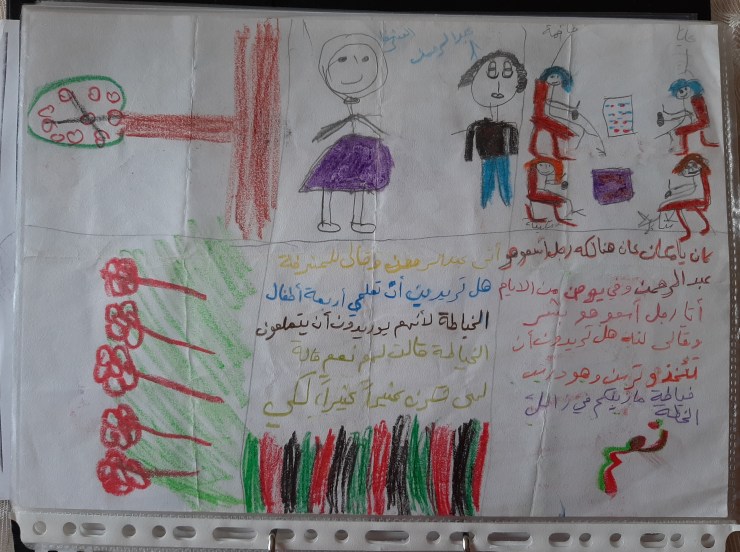 لم يكن لي سابق معرفة بالأم/المشرفة. كنت قد ناقشت والبنات صناعة دمىً (ثم تأليف قصص عنها، ثم ربما بناء مسرح صغير، ومن ثم من يدري؟) ثم تحدثت إلى خياط نعرفه جميعًا، وهو الأخ الذي ذكرته في تقريري عن رحلتي الأولى والذي جذبه العمل مع الأطفال. كنا مستعدين للبدء عندما اعتذر الخياط عن المشاركة في اللحظة الأخيرة. وفيما كنا نتشاور فيما يمكن فعله من أنشطة بديلة قالت فاطمة فجأة: ”ولكن أمي خياطة أيضًا!“