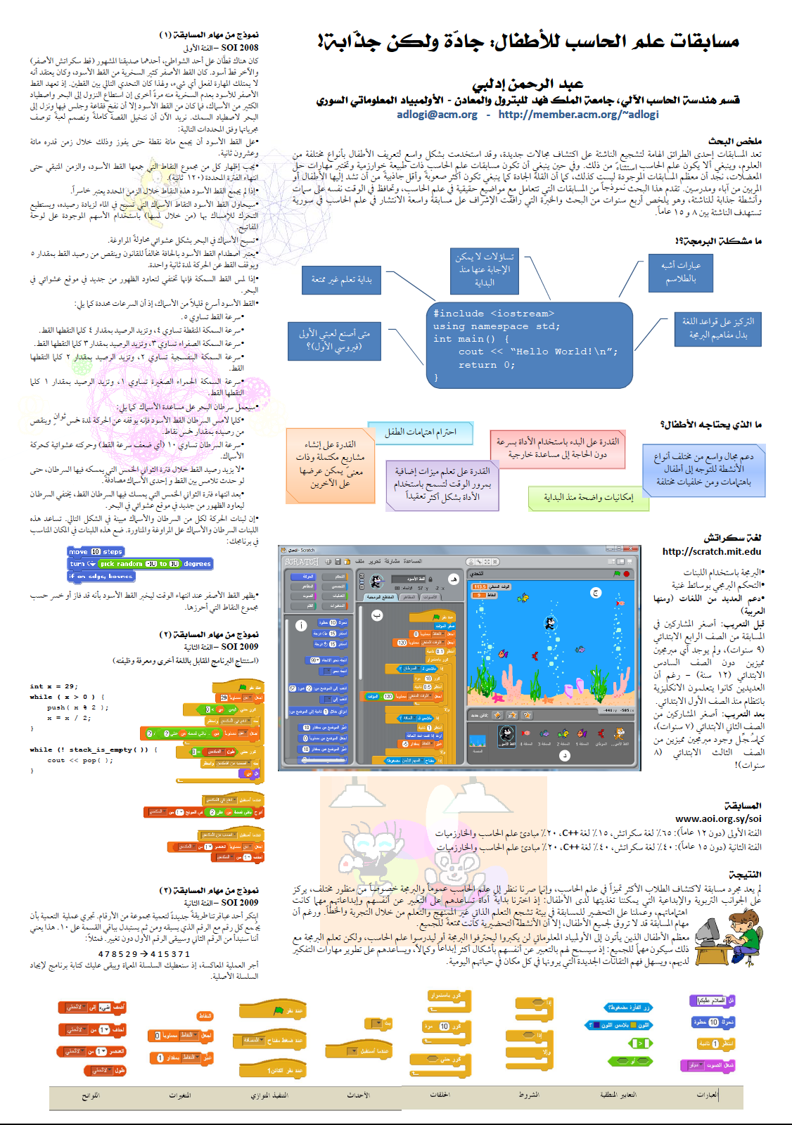 - بوستر في المؤتمر العلمي الأول لطلاب وطالبات التعليم العالي في الرياض 2010: مسابقات علم الحاسب للأطفال: جادة ولكن جذابة!